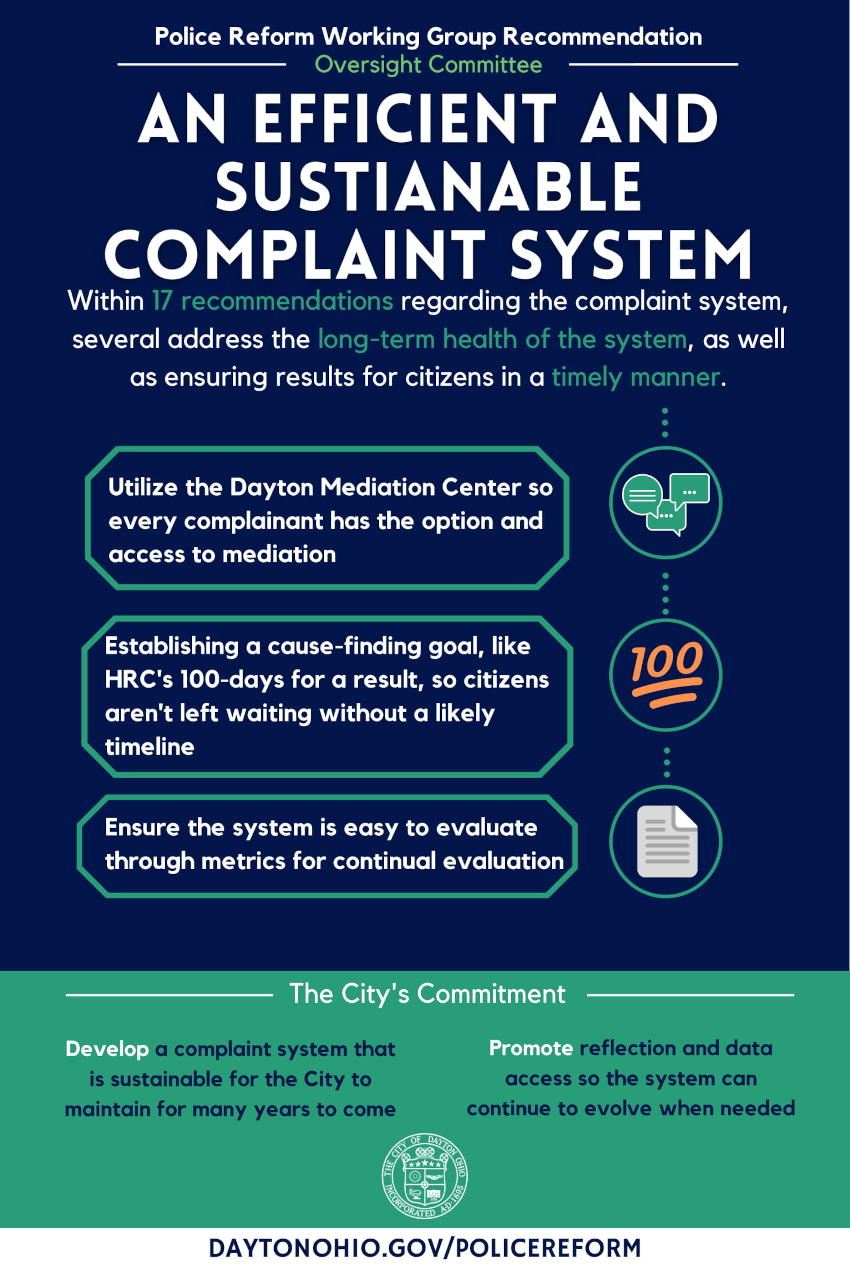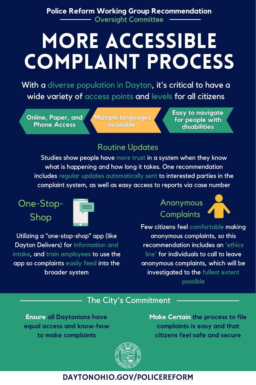 | File a formal complaint with the Dayton Police Professional Standards Bureau (PSB) | PSB either conducts an investigation or assigns the complaint to the appropriate supervisor. The Citizen receives a letter indicating the results along with Citizen’s Appeals Board process pamphlet |