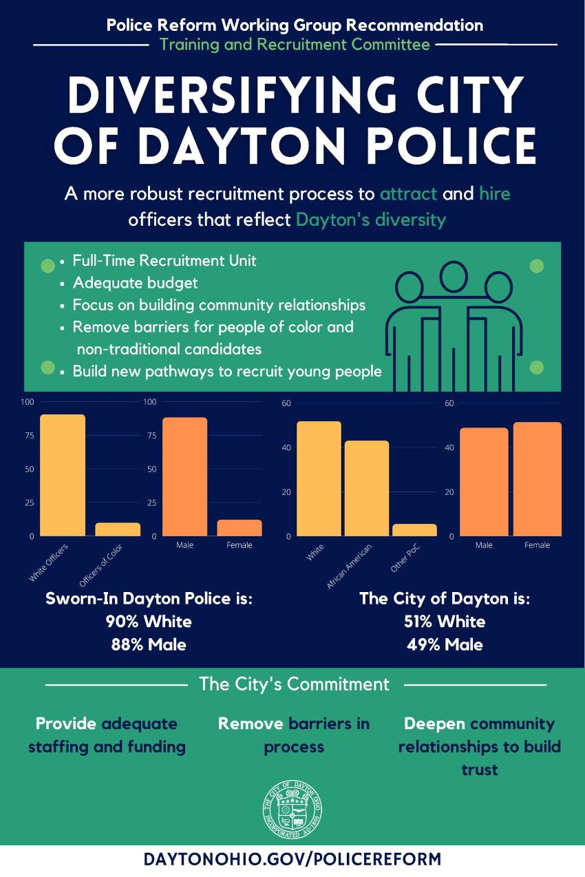 The City of Dayton relies on its Civil Service Department to hire and staff all classified positions within the City. The Dayton Police Department has been an active partner in supporting this effort, as it pertains to the department. Despite all intentions to attract and hire minority officers, the Dayton Police Department has experienced what appears to be a nationwide trend of being unsuccessful at expanding its ranks with minority officers. As the Dayton Police Department has reduced in size from a high of over 500 officers in 2000 to its current 370, the percentage of minority officers has dropped to around 9% of the force. Civil Service uses a written validated assessment which is provided by Siena Consulting. This assessment measures a candidate’s preferences, experiences, and tendencies as well as personality characteristics needed to perform on the job as an officer.